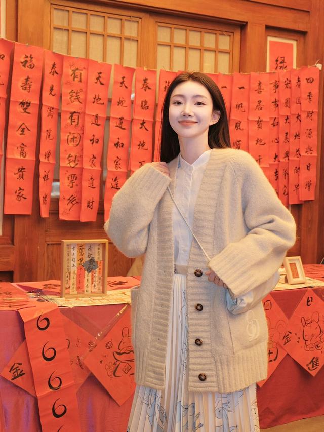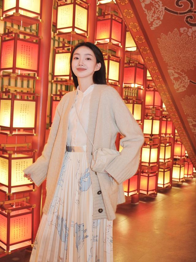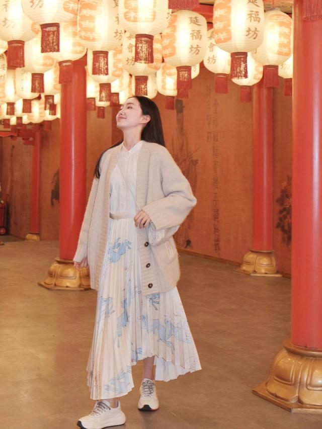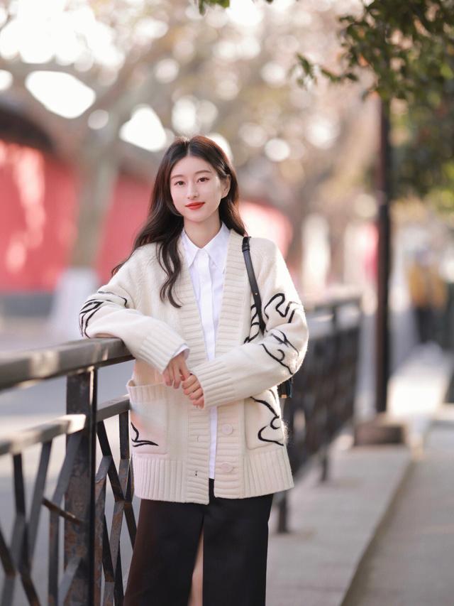 所以一开始我们才说针织衫得穿对才能提升我们的气质,让内外或者是上下完美营造显瘦+修直感,最后一套穿搭就做到了这一点,针织开衫长度刚好,加上百褶裙可以很好修饰身材,把衬衫扎进半身裙了里面提升腰线比例,显高显瘦不说还特别优雅显气质。