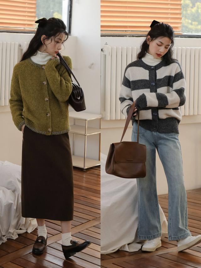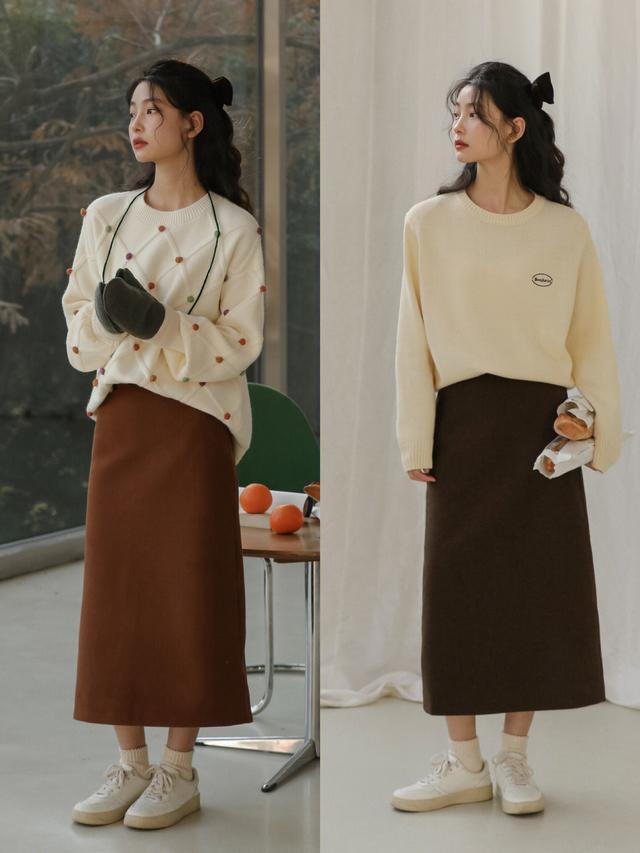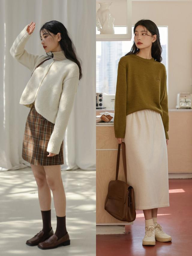技巧二、撞色搭配更能冲击视觉,还能显得有层次感不单调,下面这套就是用了撞色搭配思路,上衣都是米黄色针织衫,裙子一条是棕色、一条是咖色,和衣服的颜色有一个比较鲜明对比,上身之后不光洋气,还能对你身材比例做一个分割线,腰线在哪个位置一目了然,我们也可以利用这一点来提升自己身高哦。
