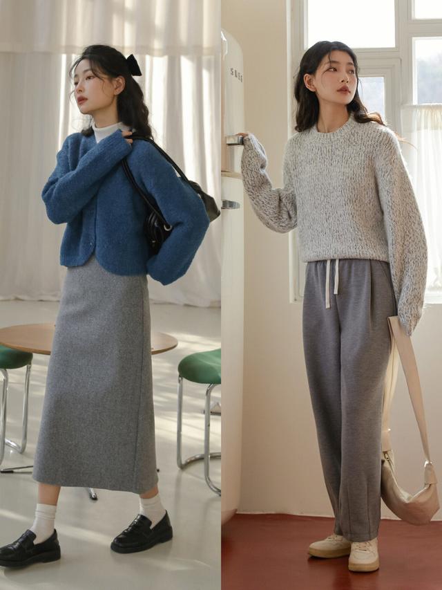 针织毛衣的版型设计花样不是那么多,自然我们要从衣服的颜色和下装多下功夫才行,想要通勤风格穿搭从基础款入手,降低衣服搭配的出错率。