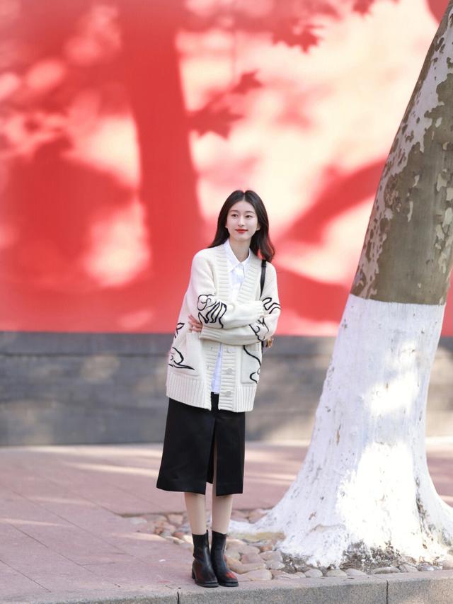 基础色搭配好了也很非常洋气,一点也不普通,想要青春靓丽的少女风格搭配,可以用“黑白”配色思路,就像下面这位时尚博主,一件米色的针织开衫内搭白色衬衫,再搭配上一条黑色半身裙和短袖,依然年轻貌美,漂亮大方。