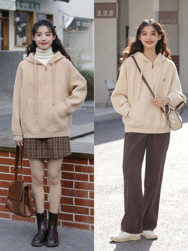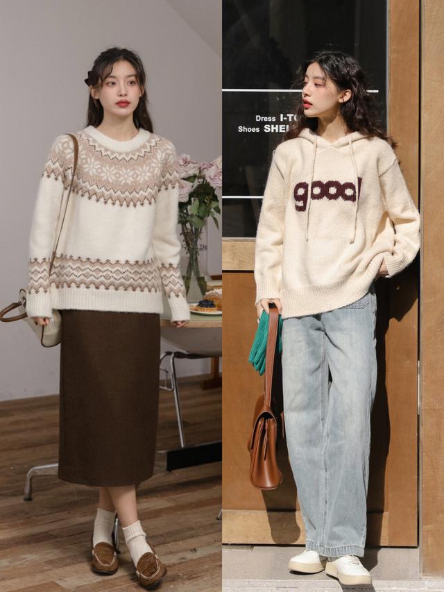 大家看下面这4套衣服穿搭就用了这搭配思路,从毛衣、卫衣、半身、牛仔裤都是选择宽松版型,如果说腿型粗胯骨宽,或者是腰间小肉肉的姑娘,小宽松版型的衣服起到遮挡效果比较明显,也更加适合我们搭配。