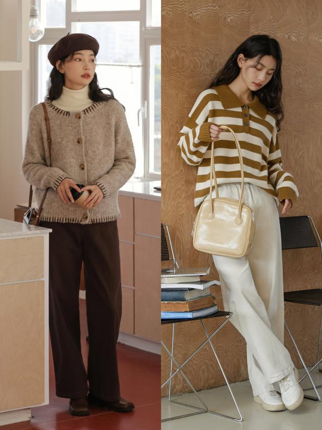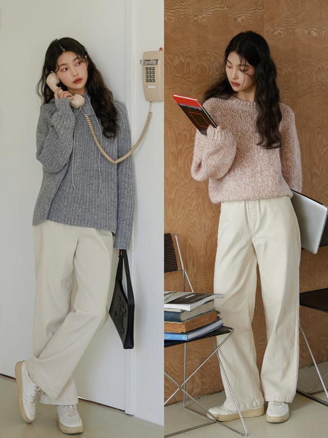 技巧一:低饱和度的颜色适合咱们小白人群,颜色不张扬好搭配不容易出错,就像下面第一组图用灰色针织毛衣和浅粉色毛衣搭配上白色休闲阔腿裤,清纯又时髦。