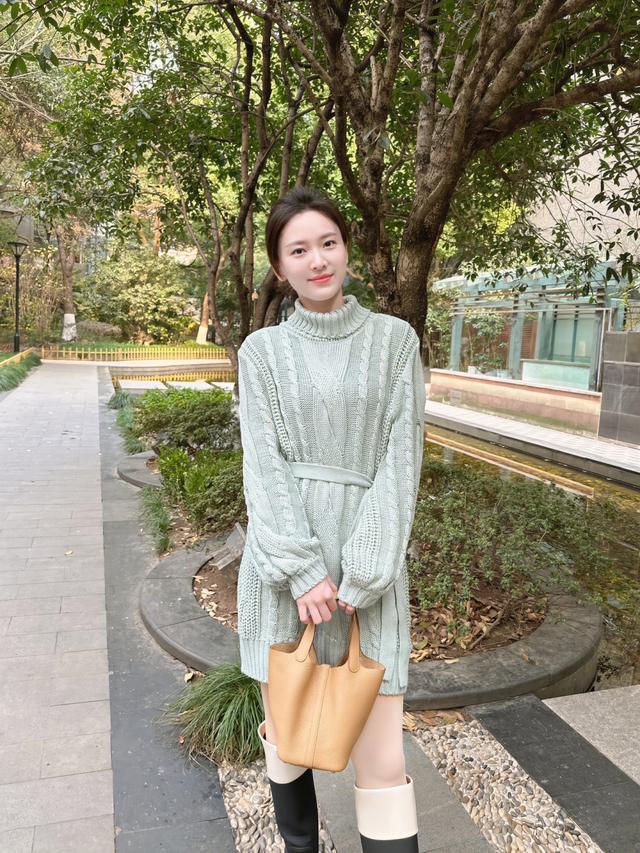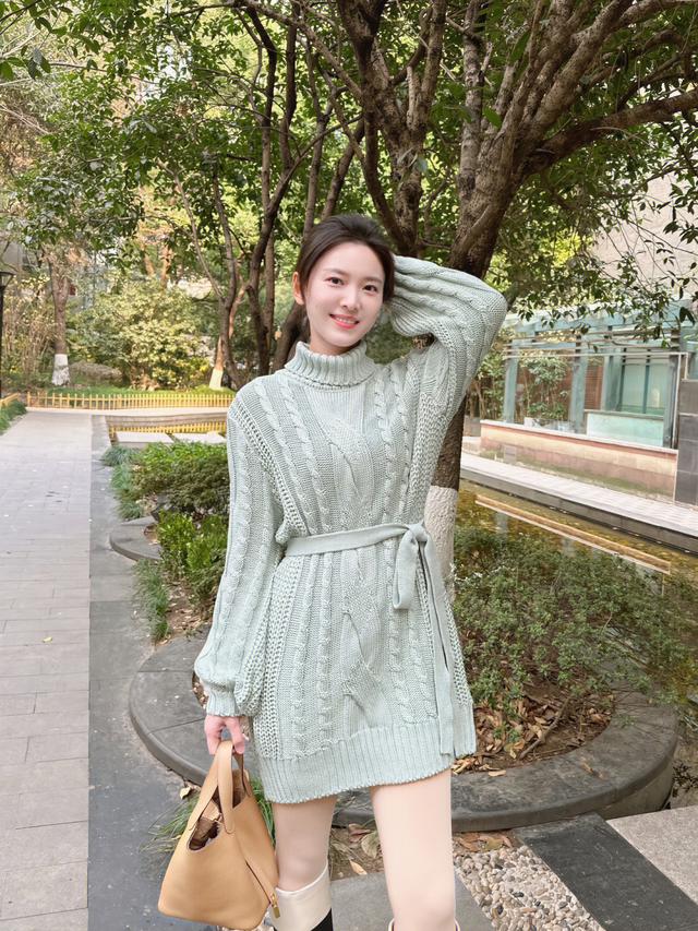 衣服的版型很修饰身材,袖子做了一个小的泡泡袖设计,穿起来会显得更加甜美俏皮,加上一个小腰带就能勒出你的小蛮腰了,一件针织连衣裙的穿搭属于下半身失踪的穿搭技巧,凸显出你大长腿优势,在用一双黑色高筒靴修饰一下,又飒又美。
