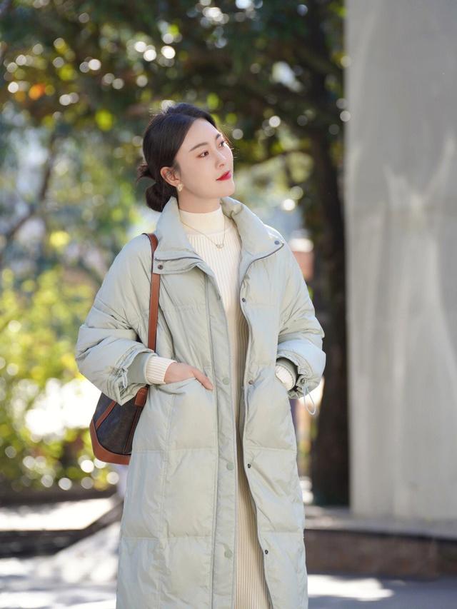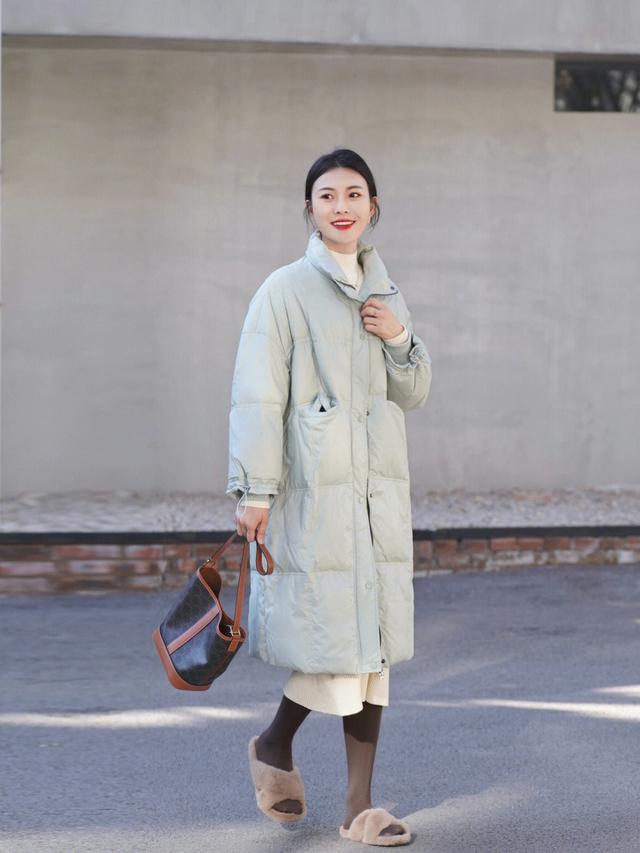 冬天最不能少的外套还有羽绒服,用针织连衣裙和羽绒服组合依然能穿出高级感,羽绒服颜色多选择浅色系列更好搭配,更能穿出青春感,街拍达人身上的是浅绿色的羽绒服,内搭白色针织连衣裙,温柔优雅。