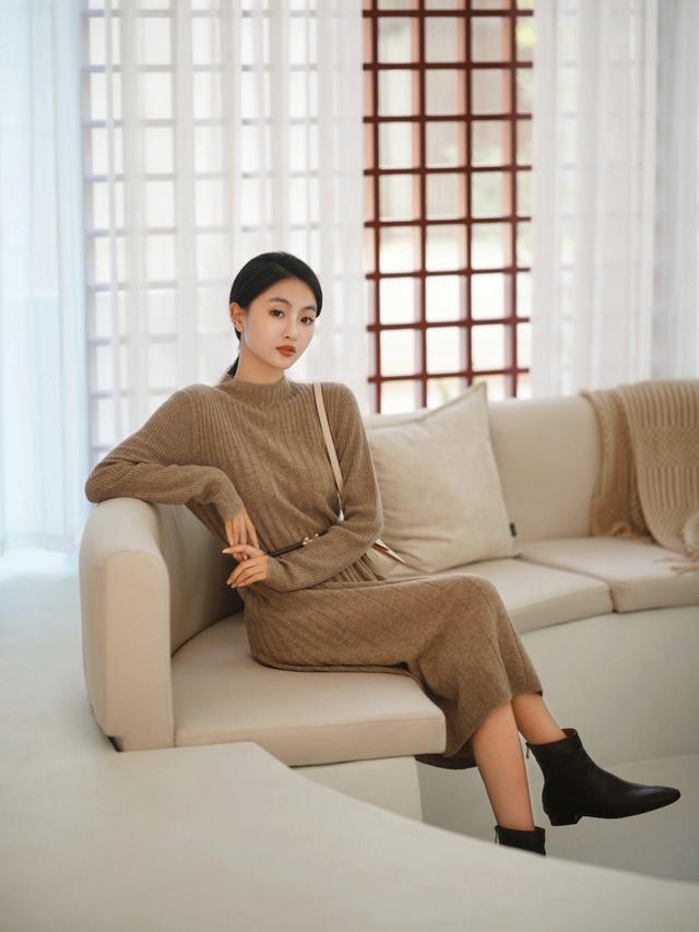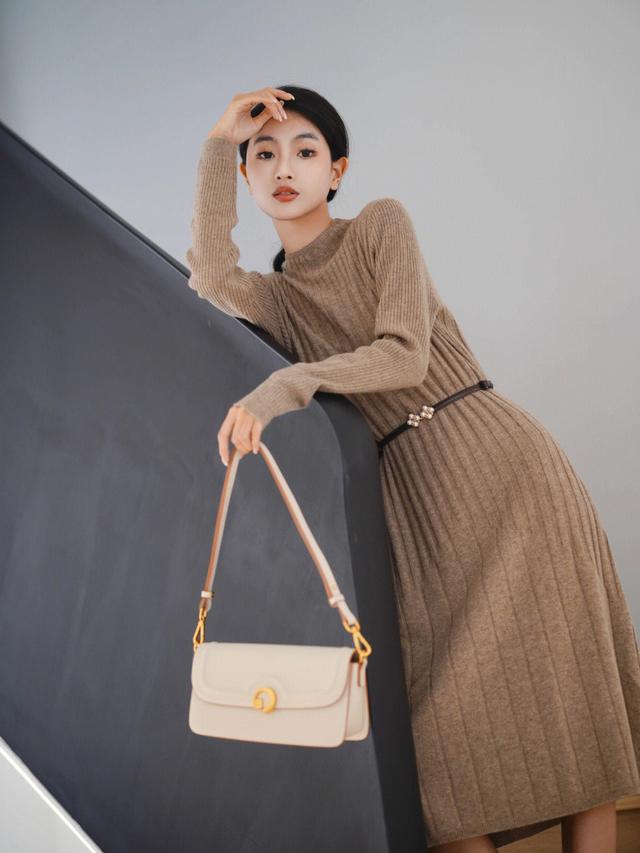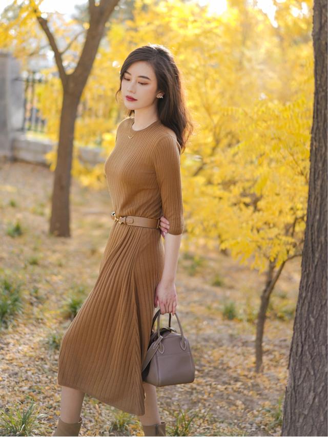上面的版型属于中长款,下面这一件浅棕色针织连衣裙属于长款,膝盖以下,脚踝以上的位置,版型的不同穿搭起来自然也有一定的区别。