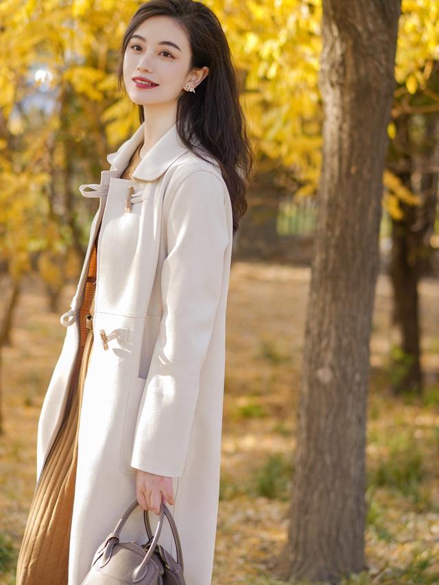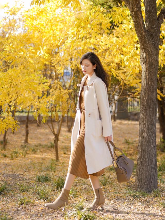 出门的时候,我们可以用一件大衣做为内搭就能做到保暖和时尚兼得,棕色的针织和牛角扣白色大衣组合,形成了一个撞色的效果,瞬间提升整个造型的气质感,显得很有品质。