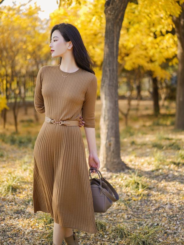 棕色的针织连衣裙更加适合梨形身材,腿型粗胯骨宽的姑娘穿搭,因为裙摆用了A字的设计,长度也能把腿部遮住,这样就看不到身材的缺点啦,如果没有做腰带设计,我们自己用小腰带来点缀,达到显高显瘦的效果。